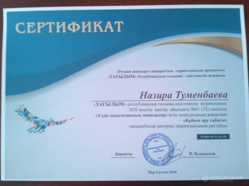 "Тағылым" республикалық ғылыми-әдістемелік журналының 2020 жылғы қаңтар айындағы №01 (72) санында "Үздік педагогикалық мақалалар" атты конкурсының жинағына "Бұйым өру сабағы" тақырыбында көркем еңбек пәнінің мұғалімі Туменбаева Н. Б. өз материалын жариялады.