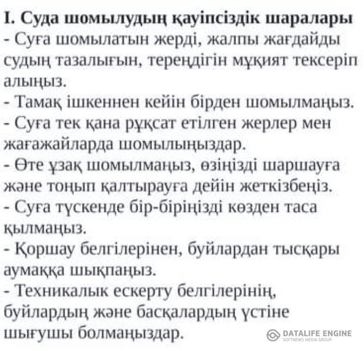 Күннің қатты ысығанынан барлық су айдындарында демалушылардың саны күрт өсуде. Суда дем алыңыздар, күштеріңізді және денсаулықтарыңызды нығайтыңыздар, бірақ есте сақтаңыздар! Судағы қайғылы жағдайларды негізгі себебі болып азаматтардың судағы қауіпсіздік ережелерін дөрекі бұзуынан немесе оны білмеуінен болады. " Су айдынындағы қауіпсіздік ережелері" тақырыбына байланысты Бауыржан Момышұлы атындағы орта мектебінің әкімшілігі мен сынып жетекшілері 2019-2020 оқу жылының жоспарына сай тәрбие сағаттар, ата- аналар жиналысын, сыныптан тыс жұмыстар жүргізді. Ауыл аймағында орналасқан өзеннің бойына қатаң ескерту белгілерін қойылды, сонымен қатар ата- аналар, оқушылар чаттарына, фейсбук парақшасына , жадынамалар мен бейнетаспалар таратылды. Су қауіпсіздігі туралы жұмыстар бақылауда болып, жалғасын табуда. Бауыржан Момышұлы атындағы орта мектебінің әкімшілігі ЕСКЕРТЕДІ: Судағы апаттан қорғаудың ең сенімді жолы - сауда шомылу ережелері мен қауіпсіздік шараларын қатаң сақтау!