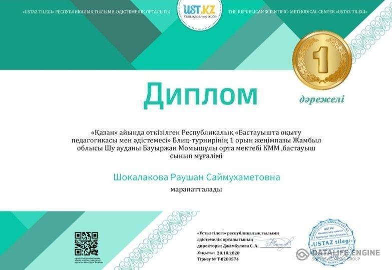 " Қазан" айында өткізілген Республикалық " Бастуышта   оқыту педагогикасы  мен әдістемесі" Блиц- турнирінің  1 орын жеңімпазы Жамбыл облысы Шу ауданы Бауыржан Момышұлы атындағы орта мектебінің мұғалімі Шокалакова Раушан Саймухаметовна 1 дәрежелі Дипломмен марапатталды