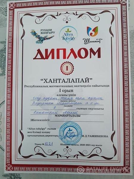 "Ханталапай" Республикалық математикалық зияткерлік сайысында Бауыржан Момышұлы атындағы орта мектебінің оқушылары І орын иеленіп Дипломдармен марапатталды