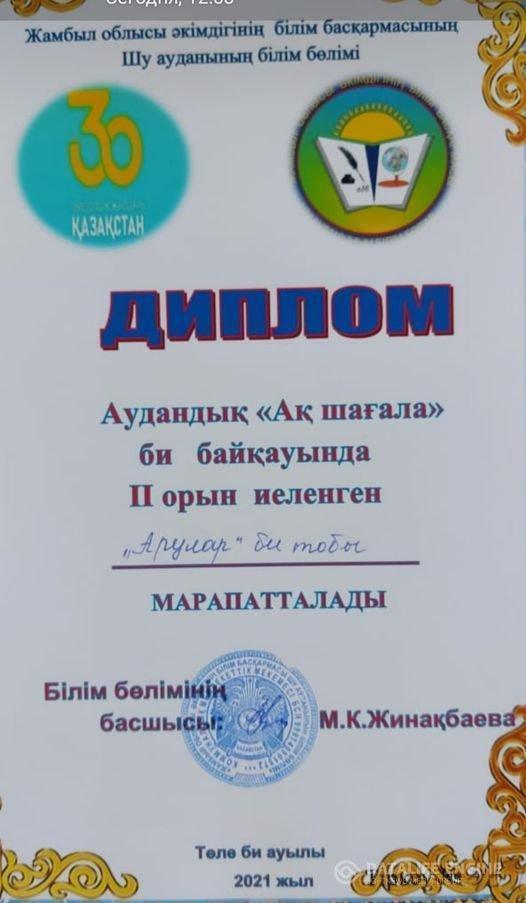 Жамбыл облысы әкімдігінің білім басқармасының Шу ауданының білім бөлімінің ұйымдастыруымен өткен " Ақ  шағала" би байқауында  Бауыржан Момышұлы атындағы  орта мектебінің "Арулар " би тобы ІІ орын иеленіп Дипломмен марапатталды