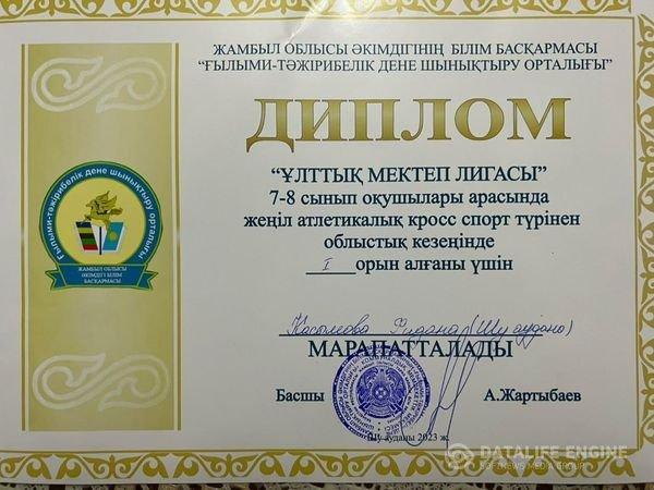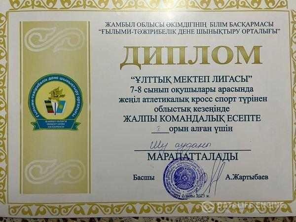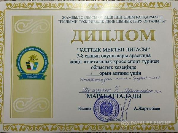 Жамбыл облысы әкімдігінің білім басқармасы "ғылыми- тәжірибелік дене шынықтыру орталығы" ұйымдастыруымен "Ұлттық мектеп лигасы" 7-8 сынып оқушылары арасында жеңіл атлетикадан кросс түрінен жалпы командалық есепте Бауыржан Момышұлы атындағы орта мектебінің 8 сынып оқушылары І орын Дипломымен марапатталды. Жетекшілері: Гулиев Ф. Н, Байдаулетов А.А.