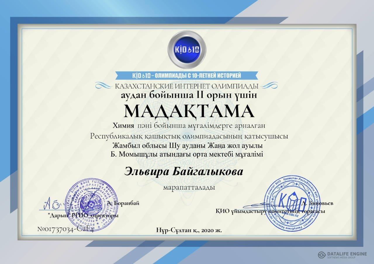Химия пәнінің мұғалімі Байгалыкова Э. А. химия пәні бойынша мұғалімдерге арналған Республикалық қашықтық олимпиадасына қатысып жүлделі орынға ие болды.
