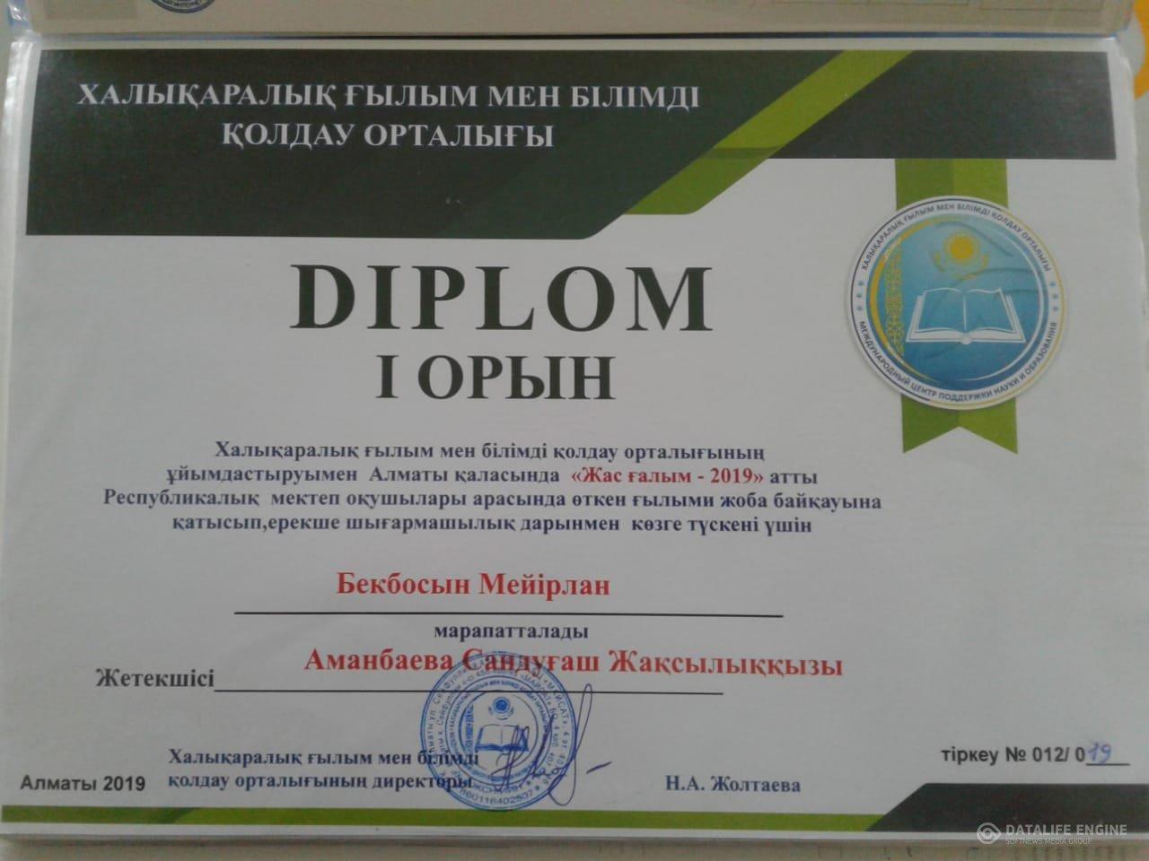 "Жас ғалым - 2019" атты Республикалқ мектеп оқушылары араснда өткен ғылыми жоба байқауына қатысып, ерекше шығармашылық дарынмен көзге түскені үшін Бекбосын Мейірлан 1 орын ДИПЛОМ және Аманбаева Сандуғаш Жаксылыққызы  Аллғыс хатпен марапатталды.