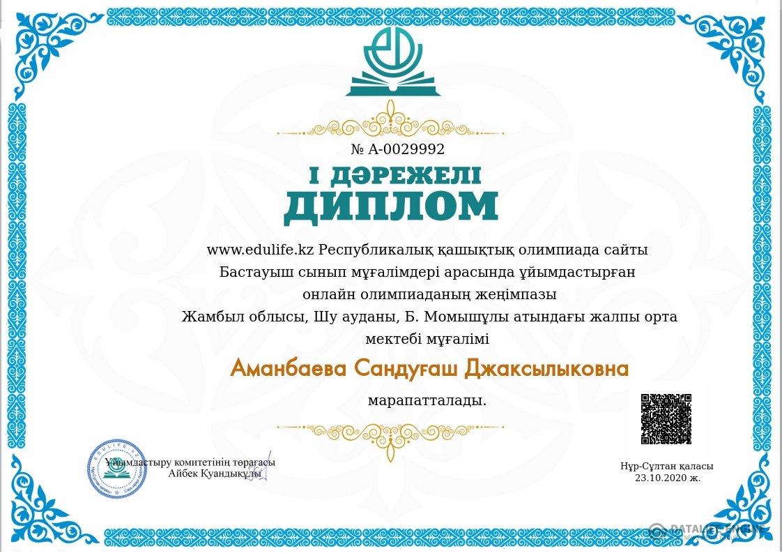EDULIFE.kz Республикалық қащықтық олимпияда сайты Бастауыш сынып мұғалімдері арасында ұйымдастырған онлайн олимпияданың І дәрежелі Дипломның жеңімпаздар Бауыржан Момышұлы атындағы орта мектебінің мұғалімдері Аманбаева Сандуғаш Джақсылықова және Мирзаева Арзу Гусейнова марапатталды.