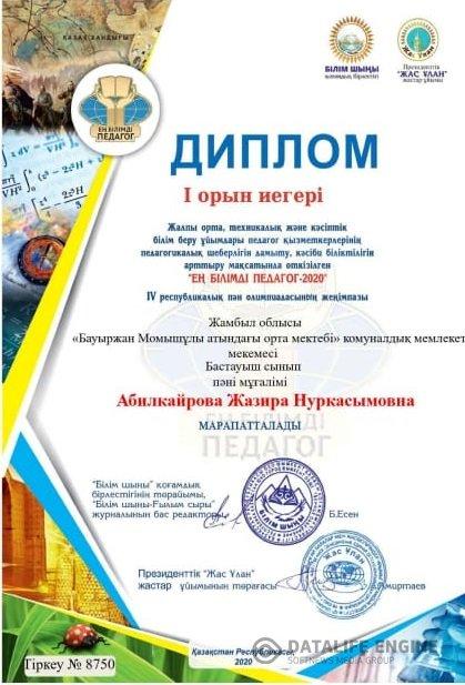 "Ең білімді педагог - 2020" ІV республикалық пән олимпиядасында І орын және EduLife.kz қашықтық олимпиядасында І орын Дипломмен марапатталды.