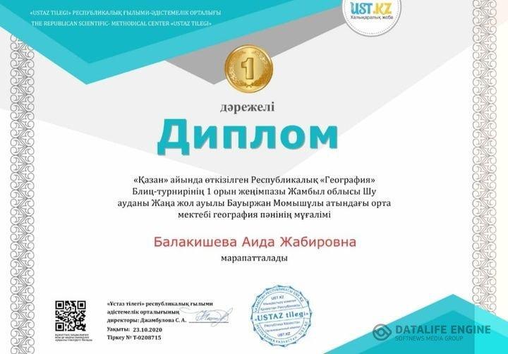 " География" Блиц- турнирінің 1 орын жеңімпазы Жамбыл облысы Шу ауданы Бауыржан Момышұлы атындағы орта мектебінің мұғалімі Балаларына Айда Джабировна 1 дәрежелі Дипломмен марапатталды