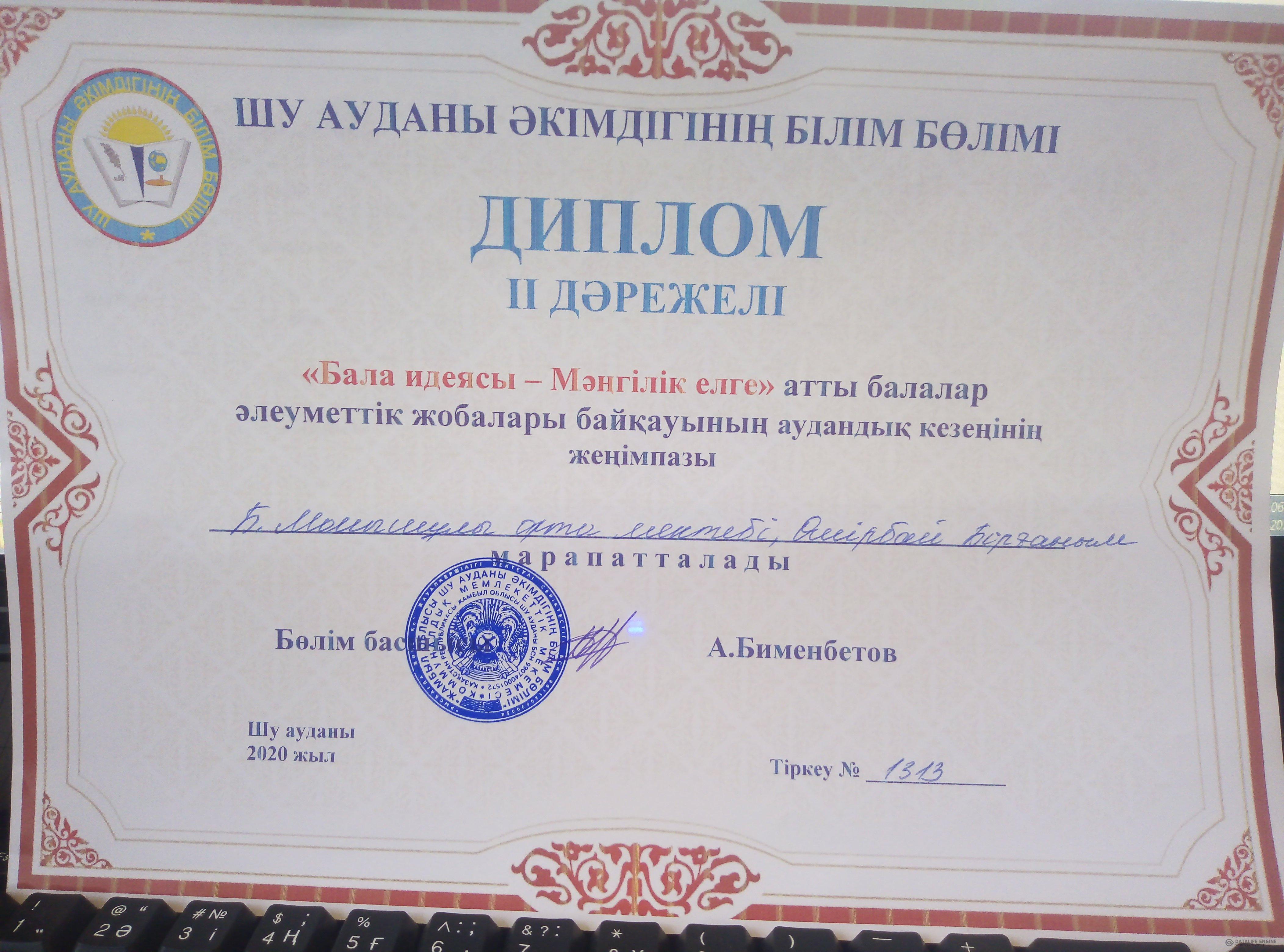 27 февраль 2020 0 1 2 3 4 5 "Бала идеясы- Мәңгілік елге" атты байқау. Бауыржан Момышұлы атындағы орта мектебінің 8 сынып оқушысы "Бала идеясы - Мәңгілік елге" атты балалар әлеуметтік жобалары байқауының аудандық кезеңінің ІІ дәрежелі Дипломымен марапатталды. Жетекшісі: Нуриева Айгерим Жумахановна
