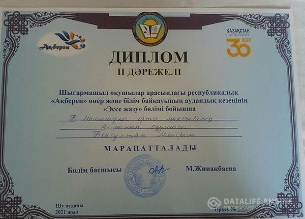 Бауыржан Момышұлы атындағы орта мектебінің 11 сынып оқушысы Тастағанова Аяжан ' Ақындар мүшәйрасы" бөлімі бойынша , ал 9 сынып оқушысы Мейірім Бексұлтан " Эссе жазу" бөлімі бойынша оқушылар арасында өткен "Ақберген" өнер және білім байқауының II дәрежелі Дипломдарымен марапатталды.