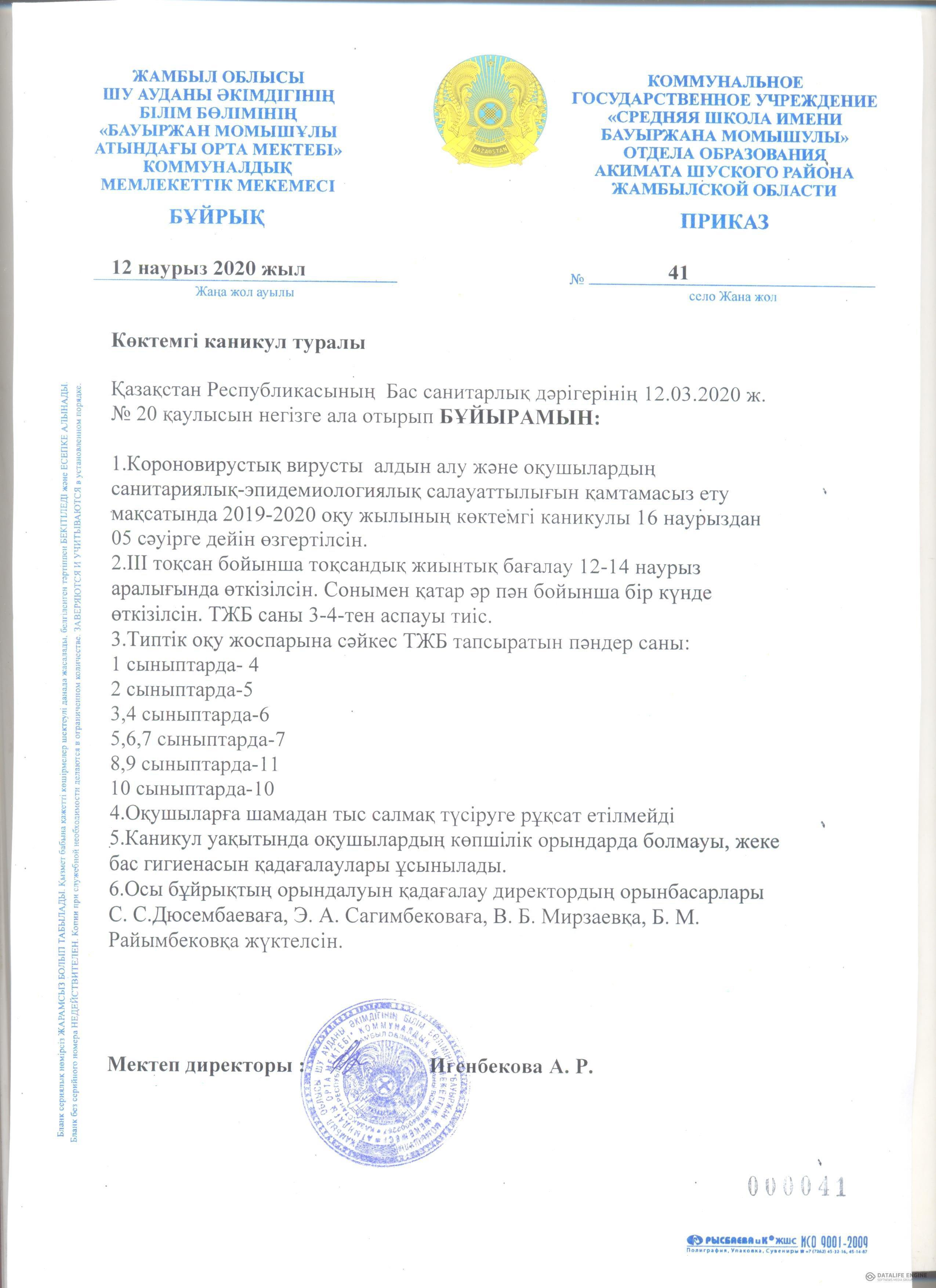 Көктемгі каникул туралы БҰЙРЫҚ » Б.Момышұлы атындағы орта мектебі