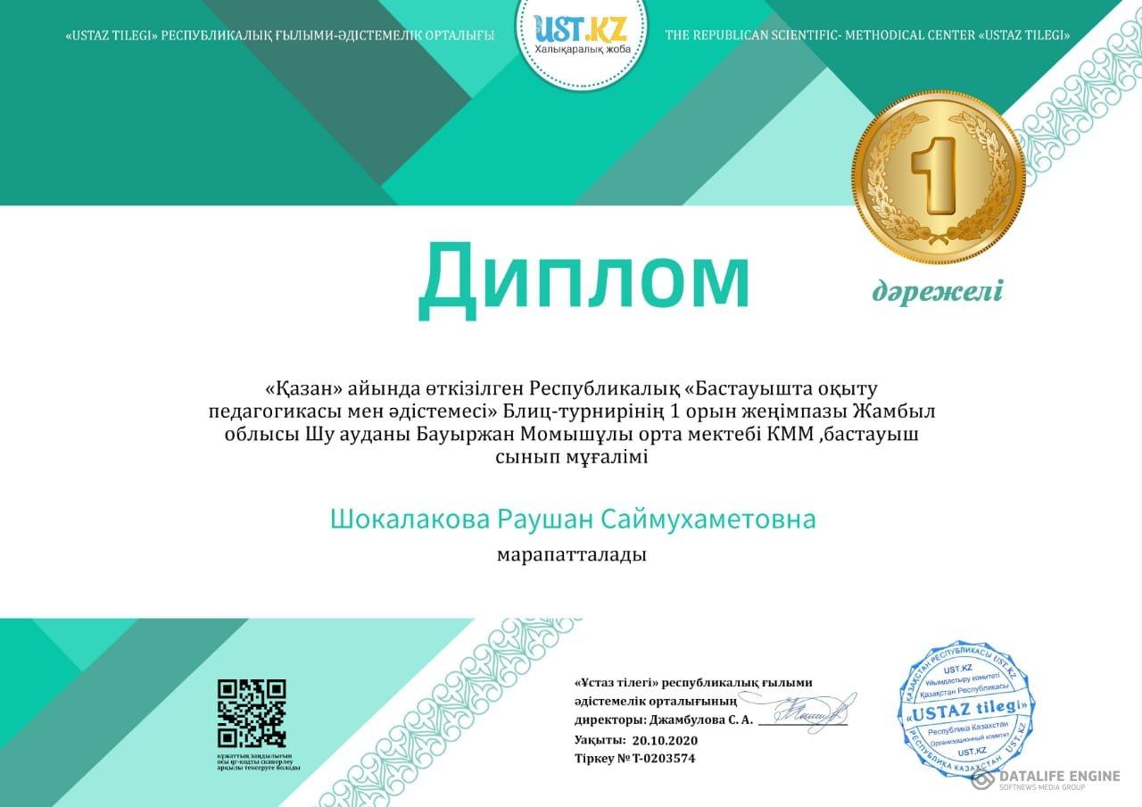 21 октябрь 2020 0 1 2 3 4 5 ДИПЛОМ Блиц-турнирінің 1 орын жеңімпазы Бауыржан Момышұлы атындағы орта мектебінің бастауыш сынып мұғалімі Шоколакова Раушан Саймухаметовна марапатталады.
