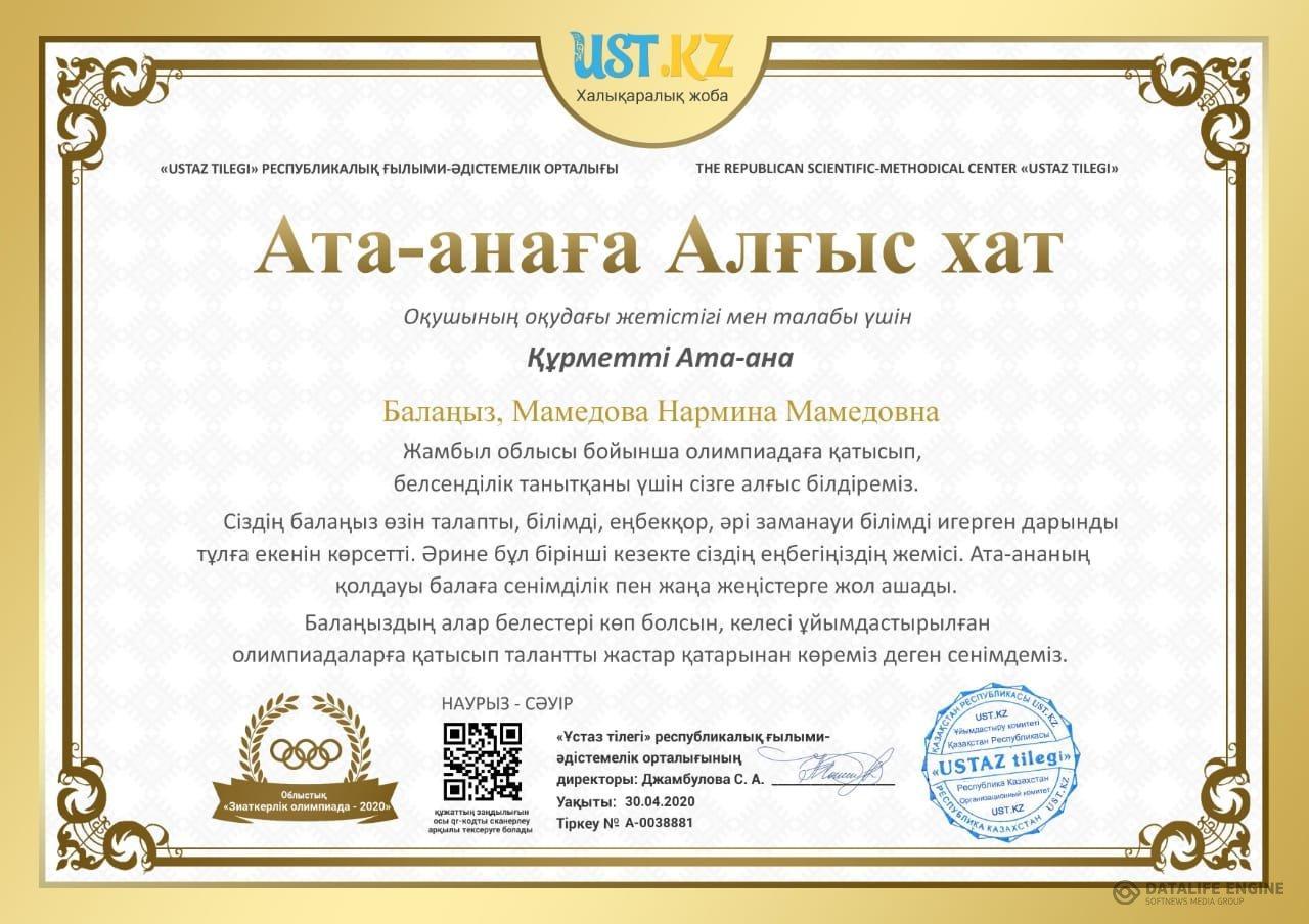 Оқушының оқудағы  жетістігі мен талабы үшін Ибрагимов Шахбаз және Мамедова Нарминаның ата - аналарына Алғыс хат берілді.