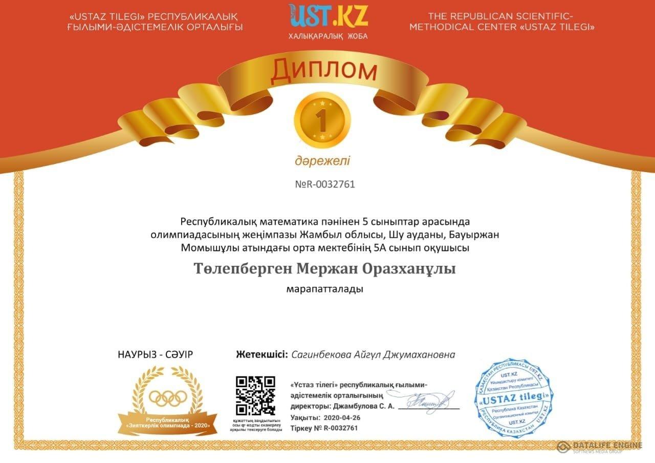 Бауыржан Момышұлы атындағы орта мектебінің 5  сынып оқушысы Төлепберген Мейіржан  республикалық математика пәнінен олимпиадасына қатысып І дәрежелі Дипломмен марапатталды.