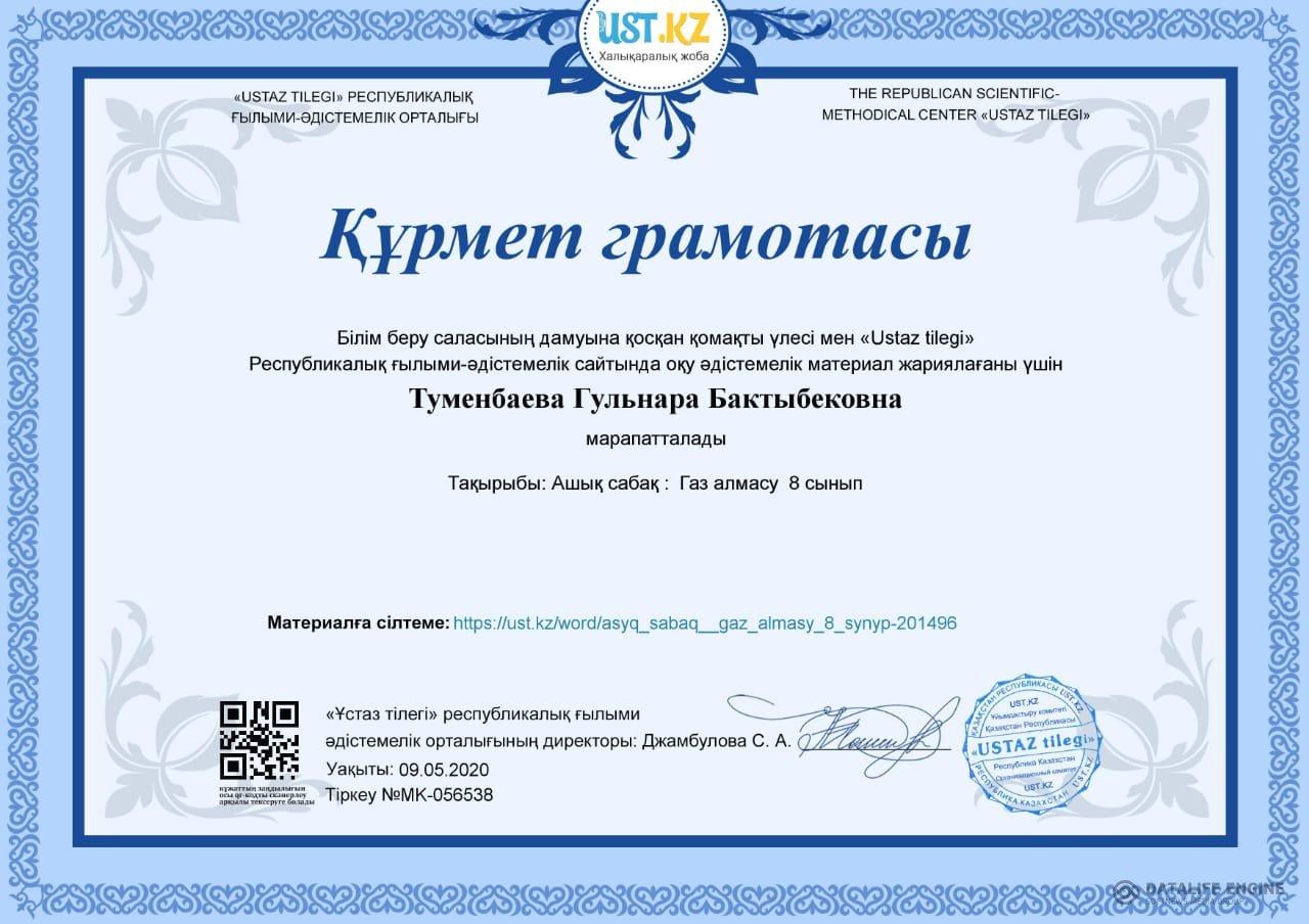 "Ustaz tilegi" Республикалық ғылыми - әдістемелік сайтында Ашық сабақ "Газ алмасу" атты тақырыбында оқу әдістемелік материалды жариялағыны үшін Туменбаева Гульнара Бактыбековна Құрмет грамотасымен марапатталады.