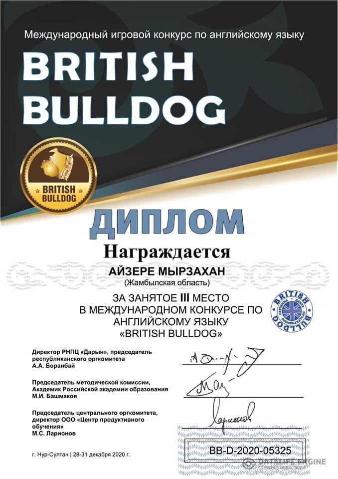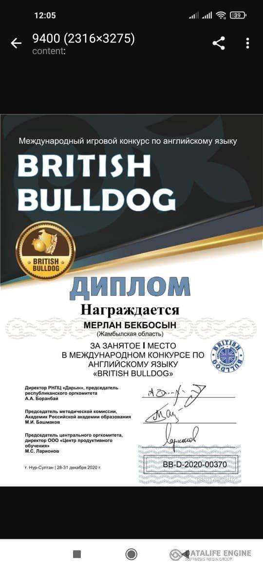 28 январь 2021 0 1 2 3 4 5 "BRITISH BULLFOG" байқауына Бауыржан Момышұлы атындағы орта мектеп оқушыларының ағылшын тілі пәні бойынша халықаралық "BRITISH BULLFOG" байқауына қатысып жүлделі орынға ие болды.Жетекшісі Нуриева Ә. Ж.
