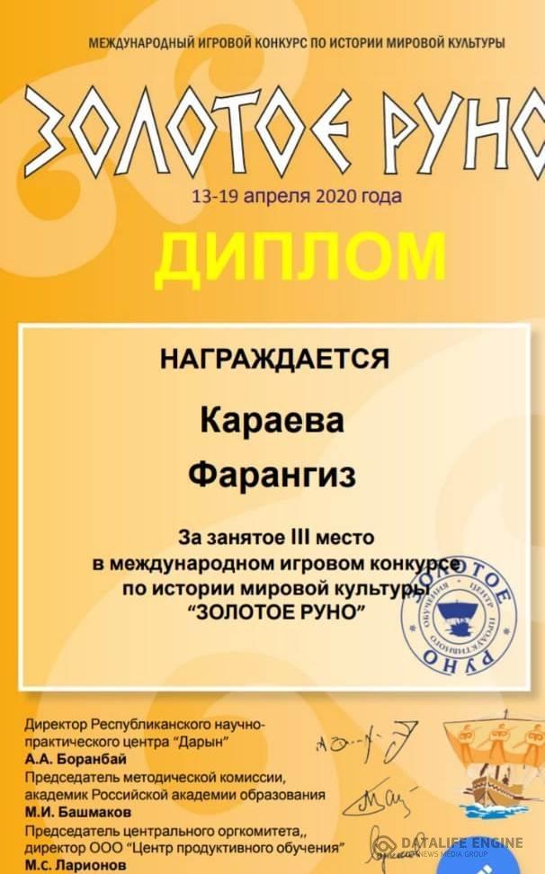 16 май 2020 0 1 2 3 4 5 ЗОЛОТОЕ РУНО Награждается Алиев Башар и Караева Фарангиз За занятое ІІІ место в международном игровом конкурсе по истории мировой культуры "Золотое руно".
